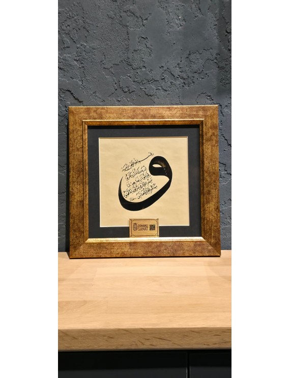 Bu derin anlamlı eserde, Vav (و) harfinin estetik formu içine, Bakara Suresi'nin son ayetlerinden (Amenerrasulü) bölümler işlenmiştir. İmanın özünü ve Allah'a teslimiyeti ifade eder. Sanatçı Hattat Hamza Doğan imzalıdır.