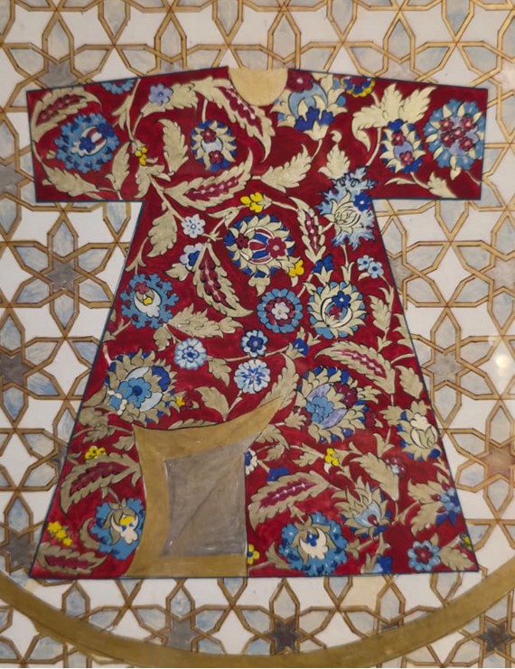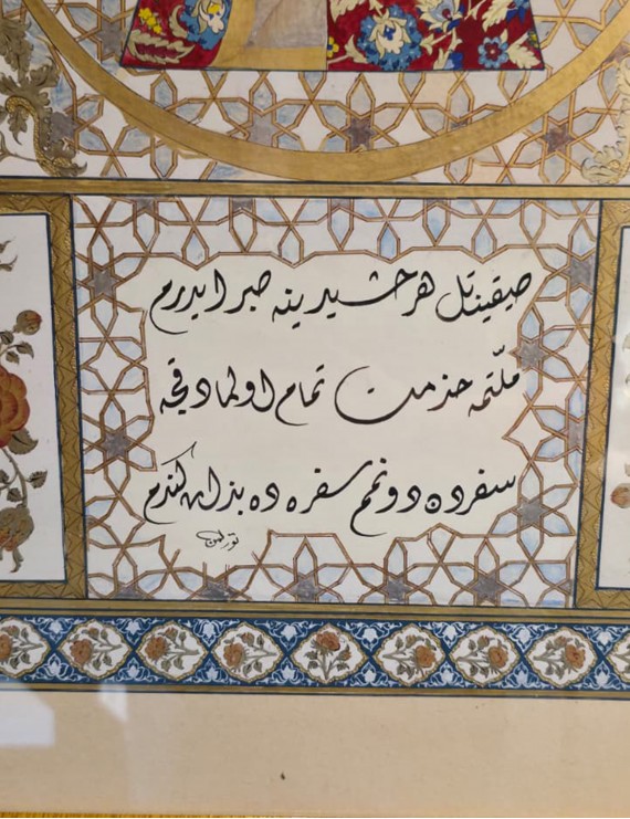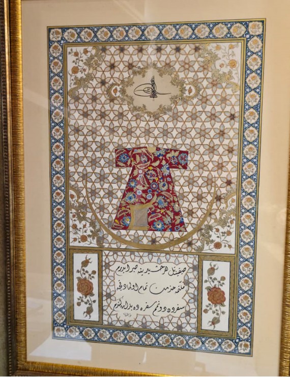 Bad-ı Seladin Sultan Koleksiyonu’nun nadide parçalarından biri olan bu özel eser, Osmanlı sanatının üç farklı dalını bir araya getiriyor. Tuğra olarak, Osmanlı padişahı Çelebi Mehmet’in zarif hat sanatındaki imzası yer alıyor. Kaftan, Hilye-i Şerif formunda nakşedilerek estetik ve manevî derinlik kazandırılmış. Üstteki hat yazısı Hattat Arda Çakmak, alttaki hat ise Hattat Hüseyin Türkmen tarafından titizlikle yazılmıştır. Tezhip süslemeleri, sanatkâr Nilgün Yılmaz’ın ustalığını yansıtıyor. Geleneksel motifler, altın varak ve renklerin uyumu, eseri koleksiyonluk bir şaheser haline getiriyor.