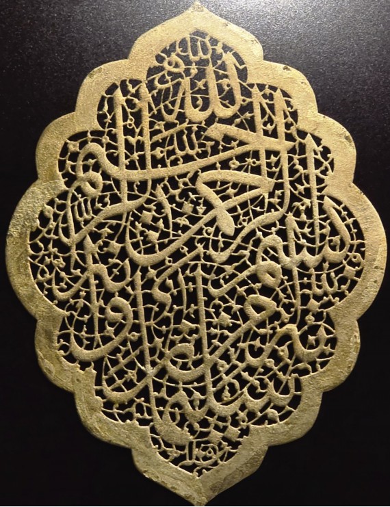 Bu eşsiz naht eseri, Arapça hat sanatını yalnızca oyma tekniğiyle değil, aynı zamanda tezhip geleneğiyle harmanlayarak sunuyor. Elipsimsi Osmanlı formlu dış çerçeve içinde oyulan yazılar, “Lâ ilâhe illallah, Muhammedun Rasûlullah” merkezli bir kompozisyon izlenimi verirken, arka planı dolduran çiçeksi geçmeler ve yıldızsı motifler, klasik İslam sanatının derinliğini yansıtır.