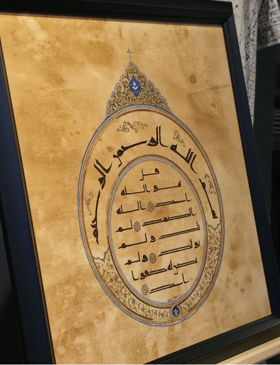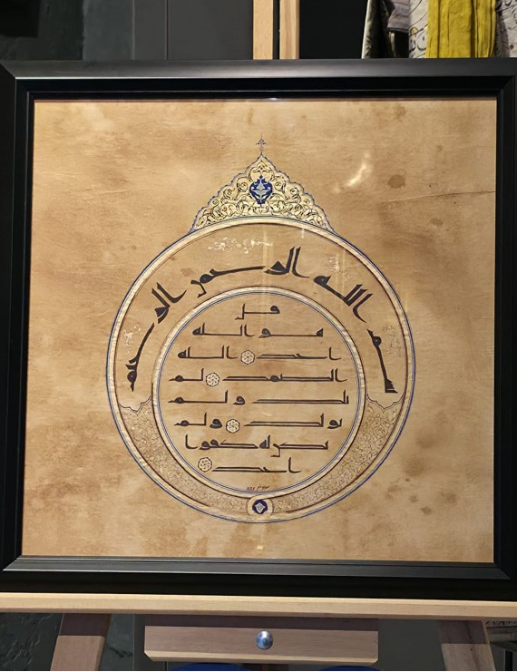 El yapımı kağıt zemin üzerinde Kufi hattıyla işlenen İhlâs Suresi, 50×50 cm ebatıyla ruhani derinliği mekânınıza taşır.